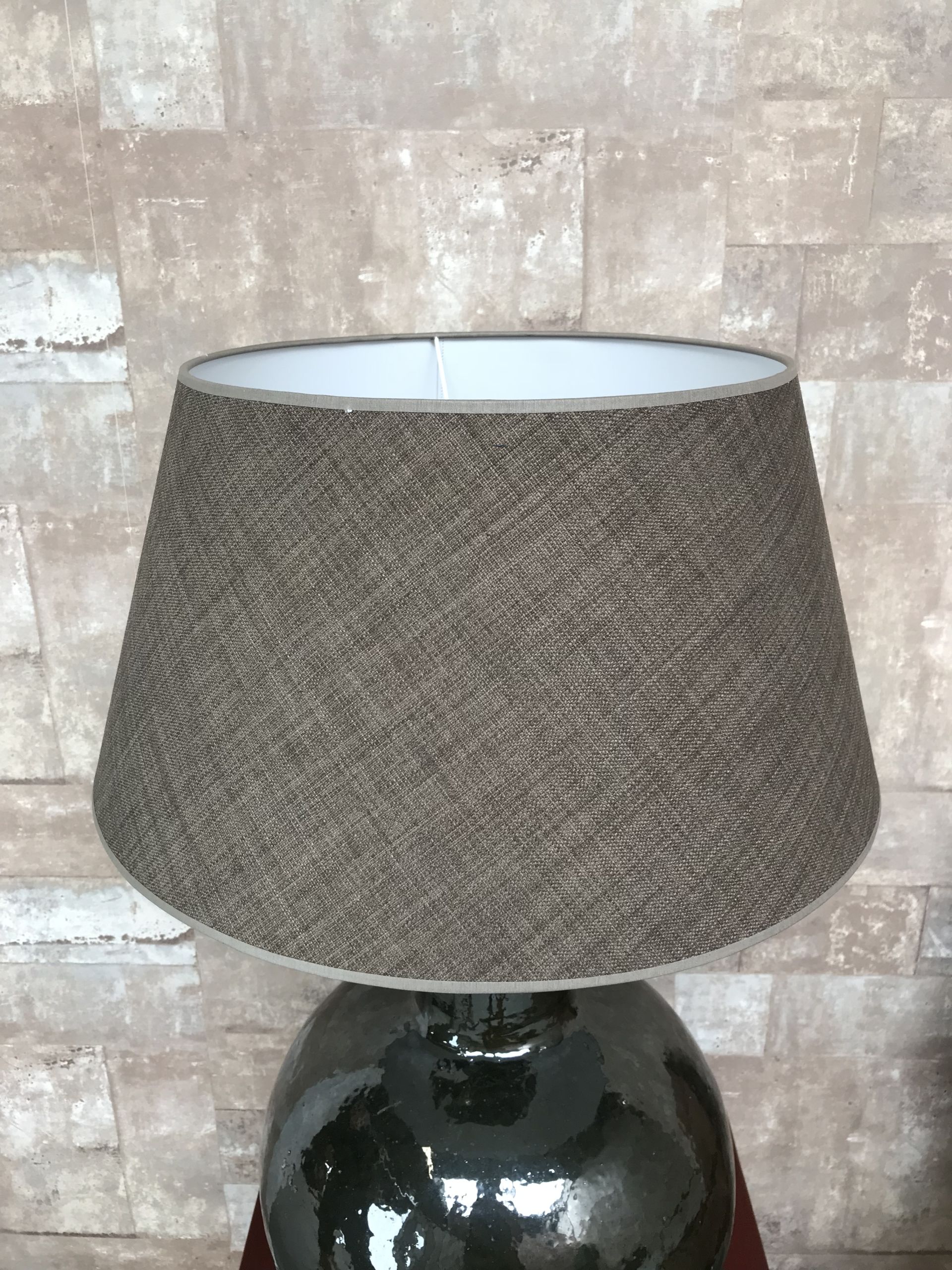 T0311410 Tafellamp aardewerk donker bruin glazuur met bruine linnen kap.