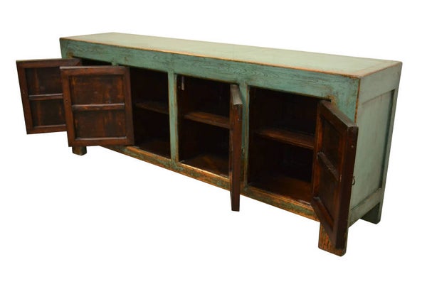 1x origineel oude handgemaakt 4 deurs elmwood Chinees dressoir (1900-1920) 20e eeuw, uit de regio van Gansu-China. Dit oude dressoir is geheel met de hand gemaakt en op authentieke wijze gerestaureerd door vakmensen uit China. Dit meubel onderscheid zich door de mooie afwerking en vooral de speciale natuur-lak laag. Deze hoog glans laklaag wordt gedurende het restauratie proces opgebouwd in wel 6 tot 8 lagen. Dit zorgt voor de exclusieve uitstraling, welke het karaktereigenschap en ziel van het meubelstuk meer laat spreken. Natuurlijk dient de lak laag ook als een extra bescherming.