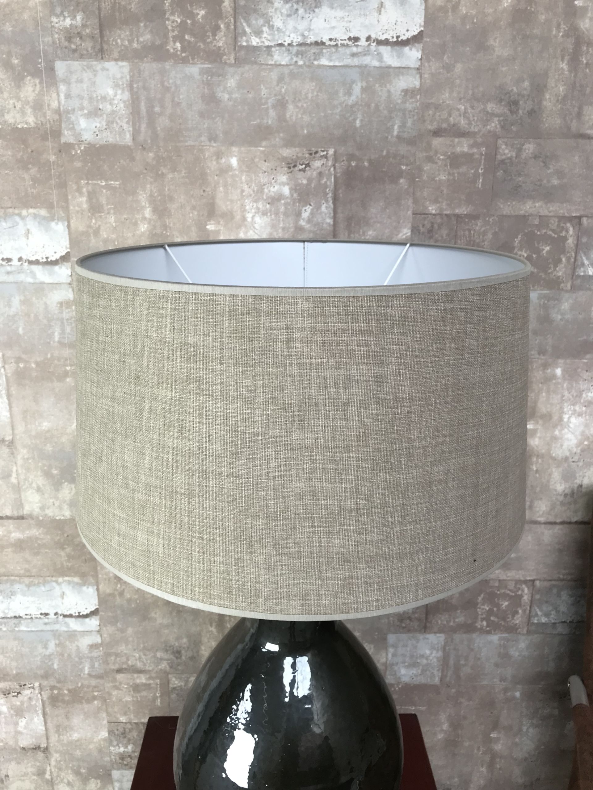 T011415 Tafellamp aardewerk donker groen glazuur met licht bruine linnen kap.