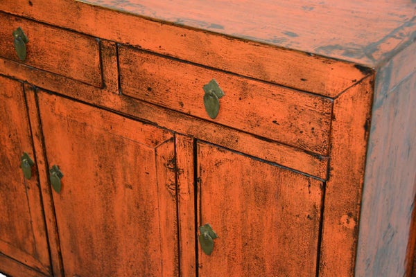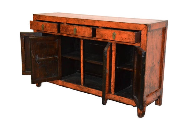 1x origineel oude handgemaakt pine wood 3 laden en 4 deurs Chinees dressoir (1900-1920) 20e eeuw, uit de regio van Fujian-China. Dit oude dressoir is geheel met de hand gemaakt en op authentieke wijze gerestaureerd door vakmensen uit China. Dit meubel onderscheid zich door de mooie afwerking en vooral de speciale natuur-lak laag. Deze hoog glans laklaag wordt gedurende het restauratie proces opgebouwd in wel 6 tot 8 lagen. Dit zorgt voor de exclusieve uitstraling, welke het karaktereigenschap en ziel van het meubelstuk meer laat spreken. Natuurlijk dient de lak laag ook als een extra bescherming.