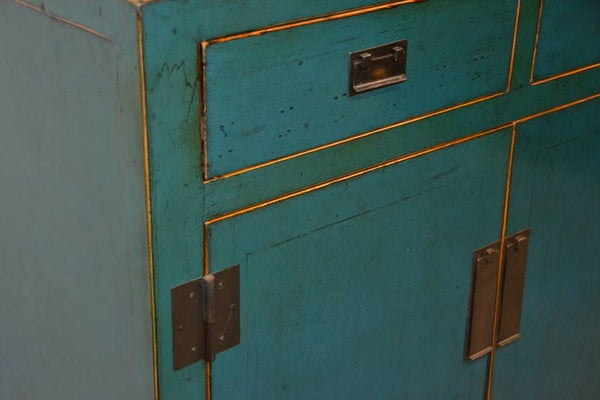 1x origineel oude handgemaakt 2 deuren en 2 laden ji-chi-mu wood Chinees dressoir (1900-1920) 20e eeuw, uit de regio van Gansu-China. Dit oude dressoir is geheel met de hand gemaakt en op authentieke wijze gerestaureerd door vakmensen uit China. Dit meubel onderscheid zich door de mooie afwerking en vooral de speciale natuur-lak laag. Deze hoog glans laklaag wordt gedurende het restauratie proces opgebouwd in wel 6 tot 8 lagen. Dit zorgt voor de exclusieve uitstraling, welke het karaktereigenschap en ziel van het meubelstuk meer laat spreken. Natuurlijk dient de lak laag ook als een extra bescherming.