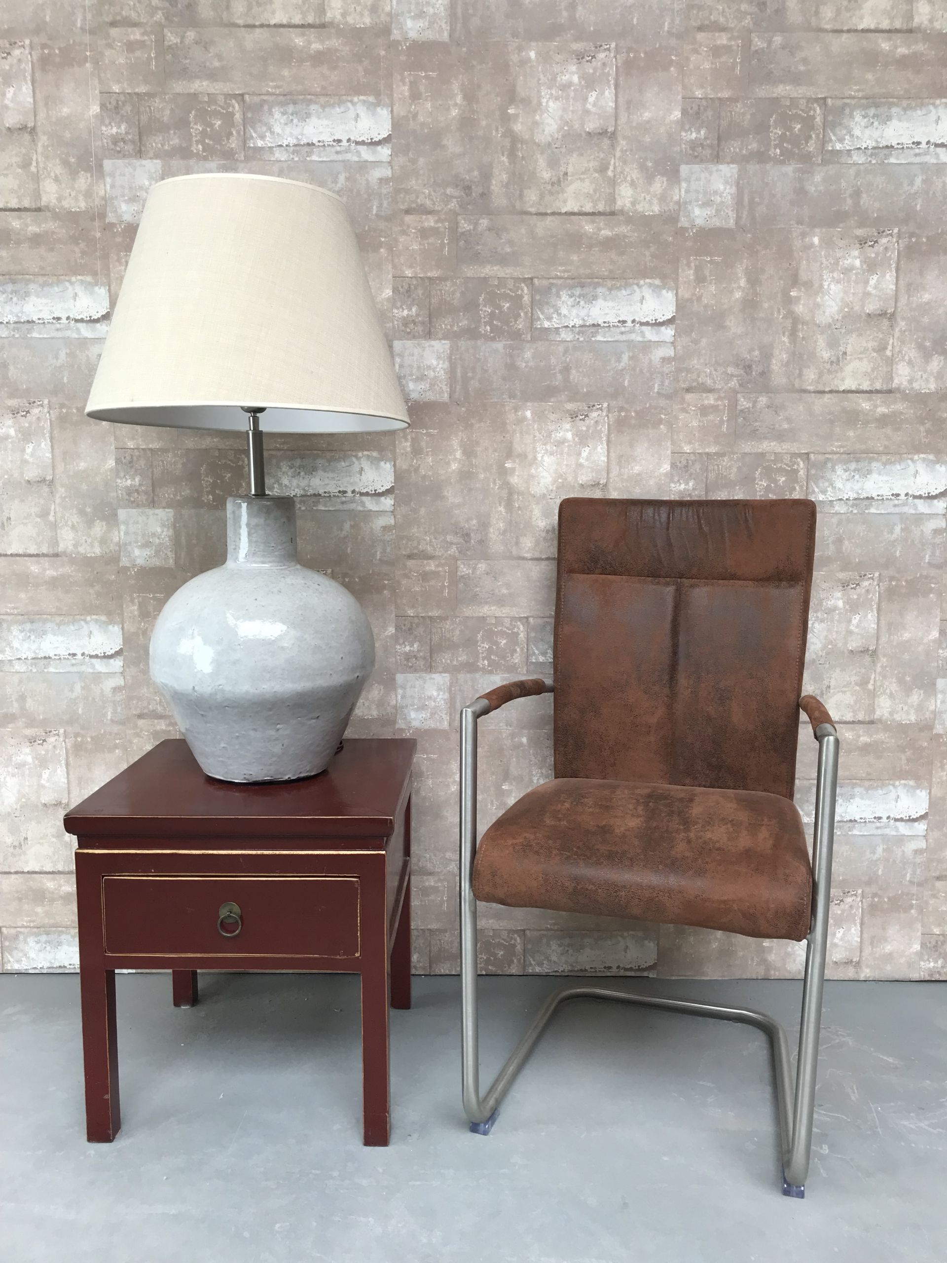 T030705 Tafellamp aardewerk grijs glazuur met creme linnen kap.