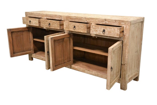 1x origineel oude handgemaakt wu-mu wood 4 deuren en 4 laden Chinees dressoir (1900-1920) 20e eeuw, uit de regio van Guizhou-China. Dit oude dressoir is geheel met de hand gemaakt en op authentieke wijze gerestaureerd door vakmensen uit China. Dit meubel onderscheid zich door de mooie afwerking en vooral de speciale natuur-lak laag. Deze mat laklaag wordt gedurende het restauratie proces opgebouwd in wel 4 tot 6 lagen. Dit zorgt voor de exclusieve uitstraling, welke het karaktereigenschap en ziel van het meubelstuk meer laat spreken. Natuurlijk dient de lak laag ook als een extra bescherming.