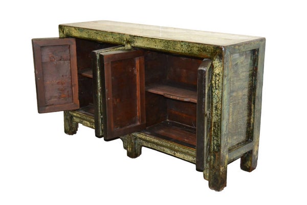 1x origineel oude handgemaakt zitan wood 4 deuren Chinees dressoir (1900-1920) 20e eeuw, uit de regio van Qinghai China. Dit oude dressoir is geheel met de hand gemaakt en op authentieke wijze gerestaureerd door vakmensen uit China. Dit meubel onderscheid zich door de mooie afwerking en vooral de speciale krakelee natuur-lak laag. Deze hoog glans laklaag wordt gedurende het restauratie proces opgebouwd in wel 6 tot 8 lagen. Dit zorgt voor de exclusieve uitstraling, welke het karaktereigenschap en ziel van het meubelstuk meer laat spreken. Natuurlijk dient de lak laag ook als een extra bescherming.