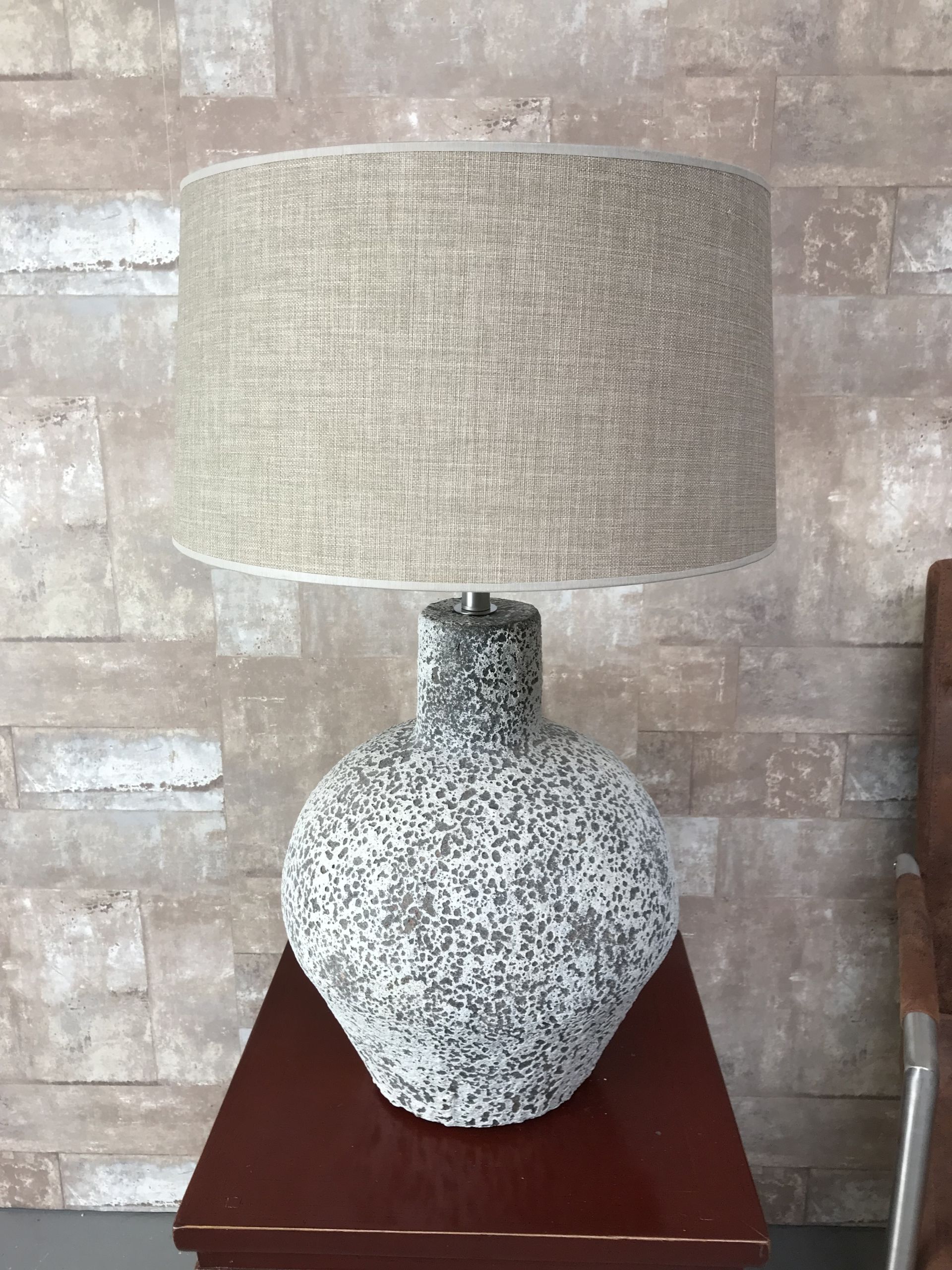 T037912 Tafellamp aardewerk ocean oxide met licht bruine linnen kap.