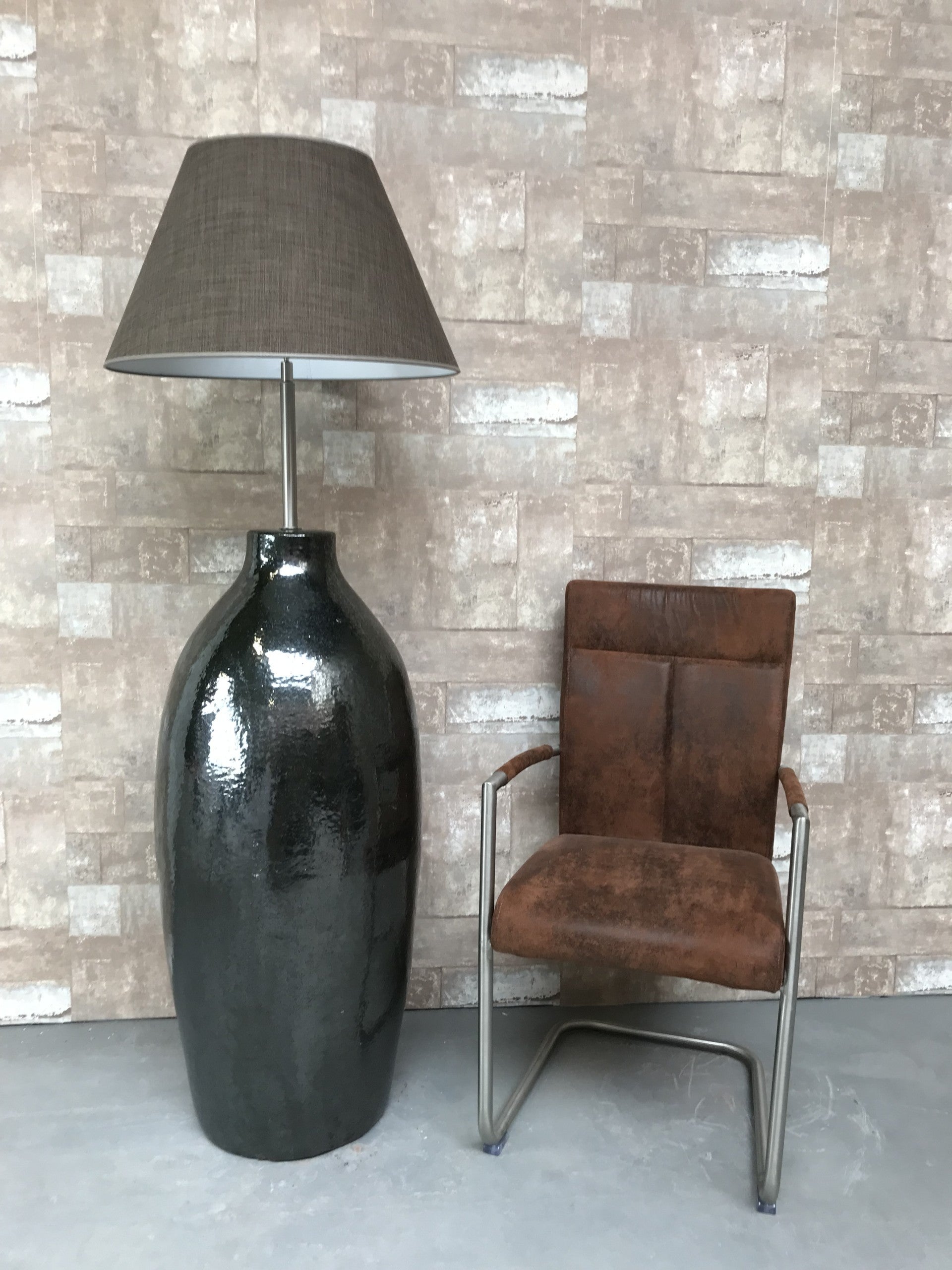 V021429 Vloerlamp aardewerk donker groen glazuur met bruine linnen kap.