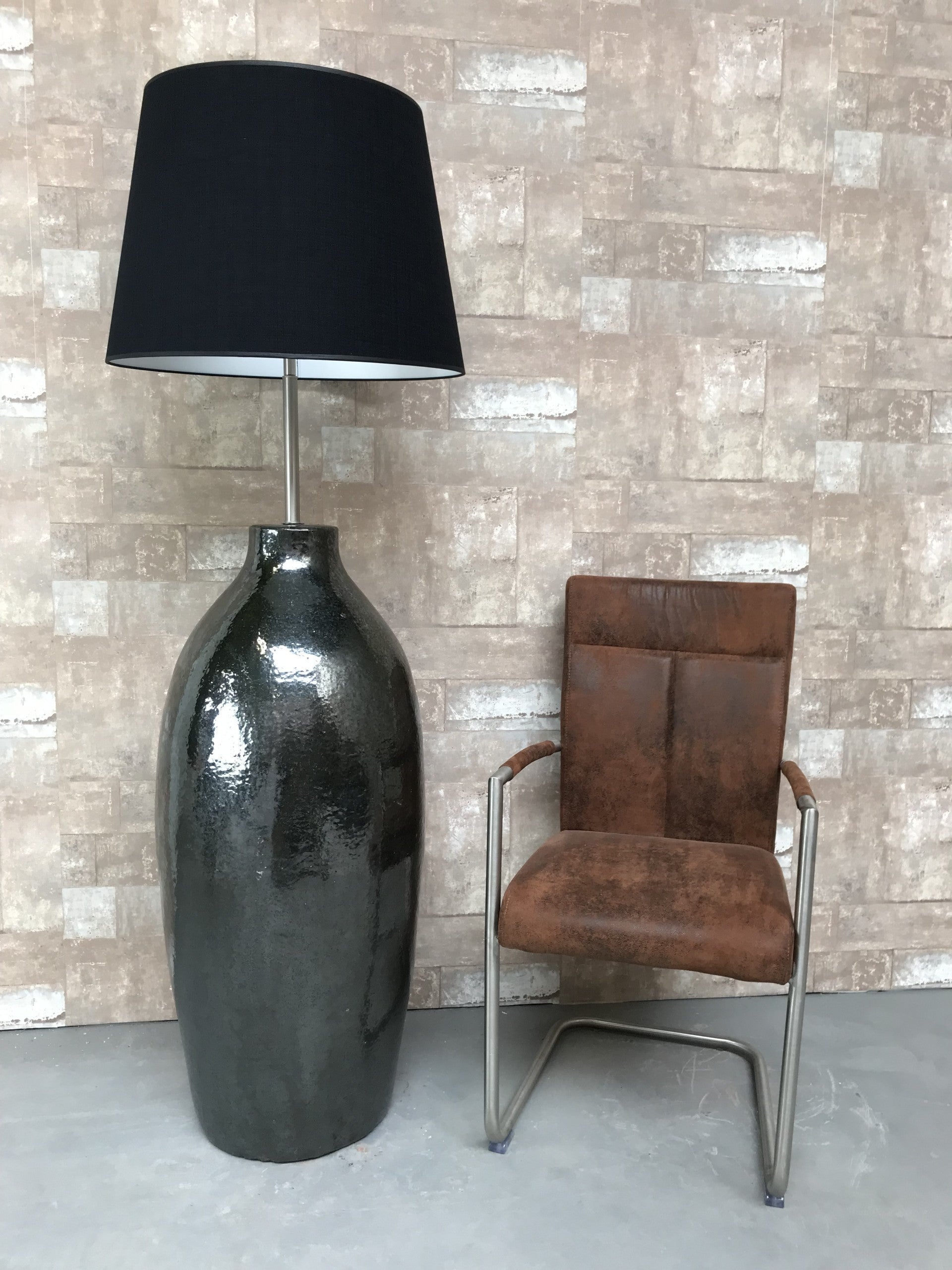 V021432 Vloerlamp aardewerk donker bruin glazuur met zwarte linnen kap.